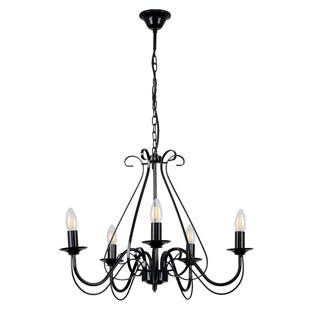 Classic five way ceiling light chandelier in gloss black finish. Featuring decorative curled details and attachments, this light fitting would look great in any home.
